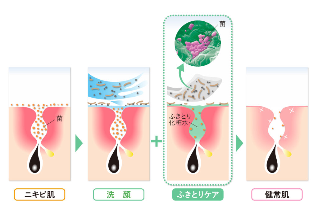 日々の洗顔だけでは、ニキビの原因菌であるアクネ菌をすべて取り除くことはできません。ふきとりケアを組み合わせることで、より効果的にアクネ菌を取り除き、ニキビの予防ならびに改善効果が期待できます。