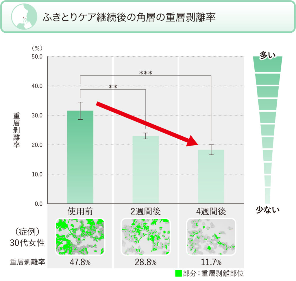 *2) 重層剥離率:角層をテープではがした際に、角層細胞が重なってはがれること。重なりが少ない方がバリア機能の整った良い肌状態と考えられる。