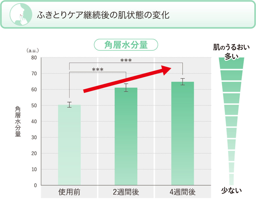 ふきとり化粧水を含ませたコットンで肌をふきとる「ふきとりケア」によって、ニキビの予防・改善が見込めることが分かりました。ふきとりケアによって、ニキビ・肌あれの原因となる皮膚常在菌・角質・皮脂汚れを物理的に除去するとともに、ふきとり化粧水に含まれる抗炎症成分が肌の炎症を抑えることで、肌質の改善効果を発揮していると考えられます。