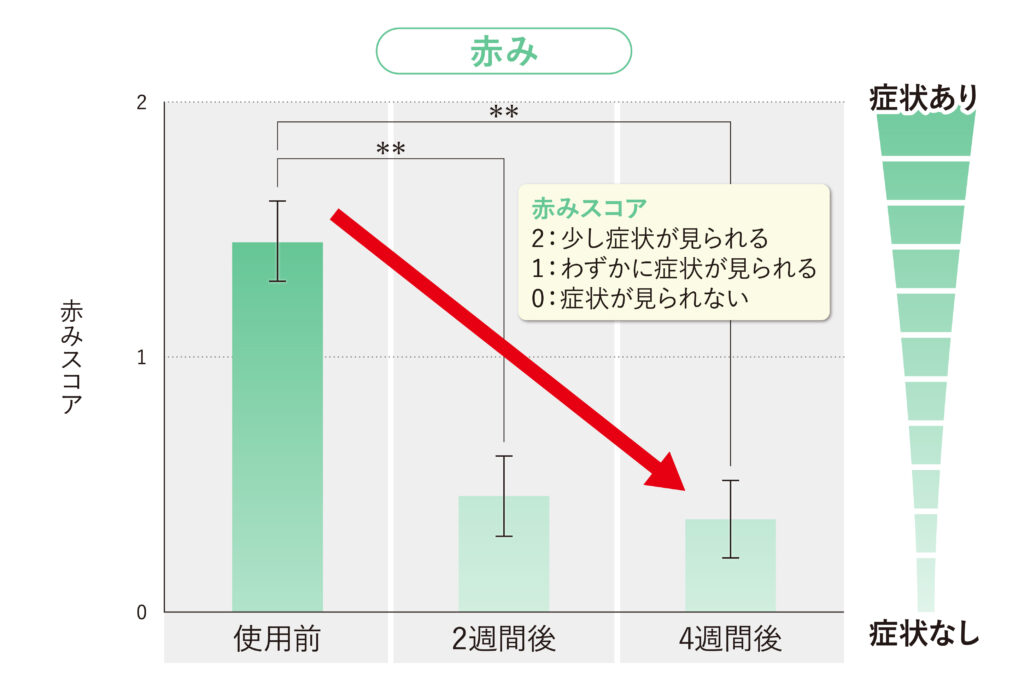 殺菌成分・抗炎症成分を配合したふきとり化粧水を含ませたコットンによるふきとりケアを4週間継続することで、角層水分量、水分蒸散量※3、赤みスコア、かさつきスコアなど、肌状態に関する指標が有意に改善していました(図11)。