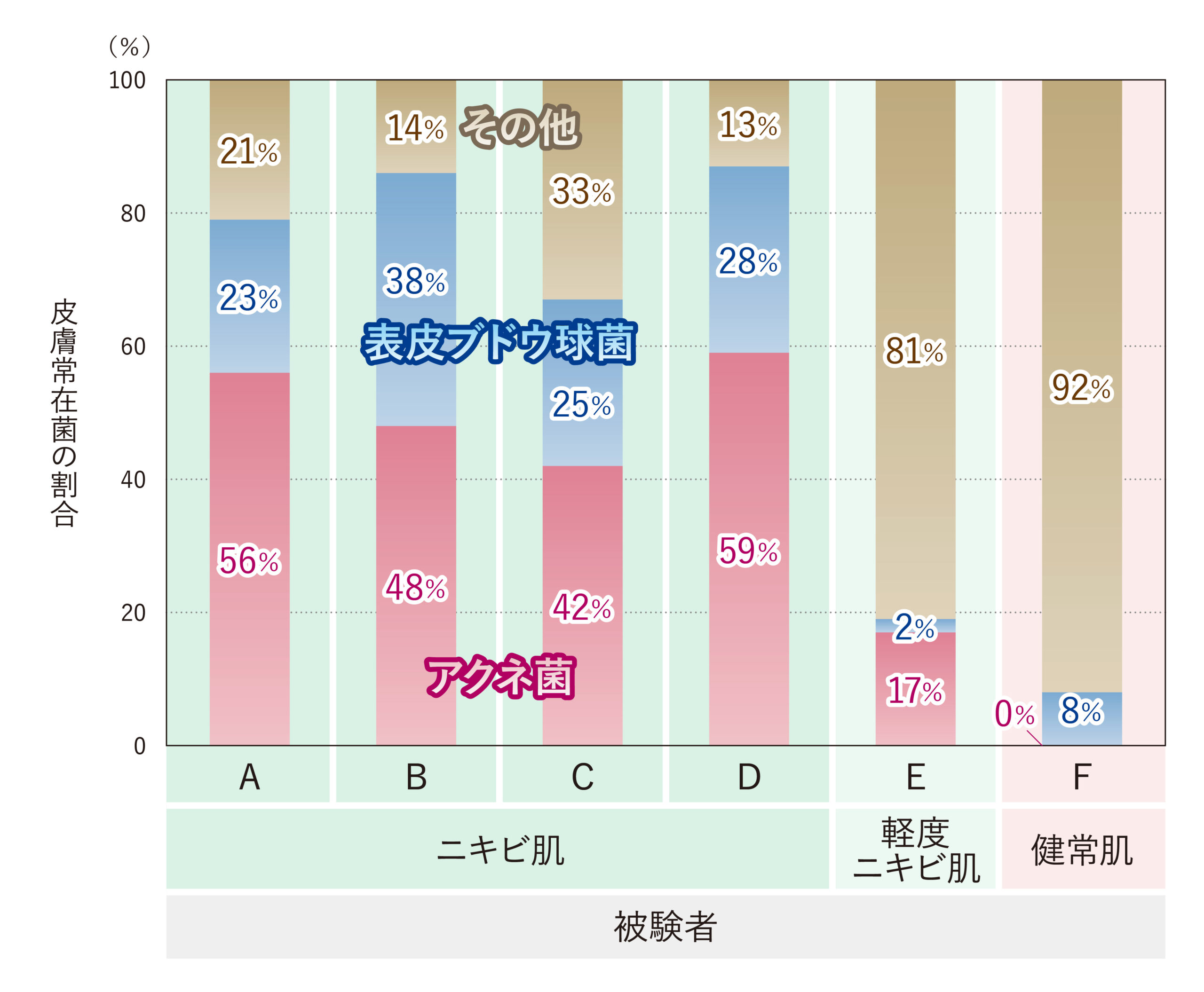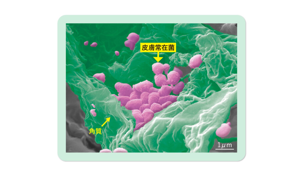 ニキビ患者の方の肌上にはニキビの原因菌であるアクネ菌がとどまり続けており、それらは日々の洗顔では除去しきれないと考えられています。ニキビ予防のための洗顔料には殺菌成分などが含まれているにもかかわらず、洗顔しても肌にアクネ菌が残存し続けるのはなぜなのか、その原因は肌内部にあるのではないかと考え、はじめに、角層中の皮膚常在菌に着目した検討を行いました。