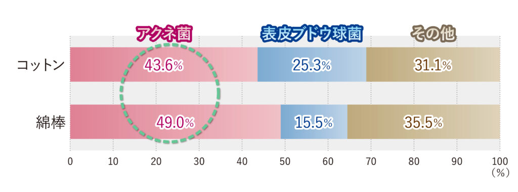 そこで、ふきとったコットンに付着している皮膚常在菌の解析を行いました。結果を図7に示します。スワブ法(綿棒)で採取した肌表面の菌と同様に、コットンからもアクネ菌をはじめとする皮膚常在菌が検出されていたことから、ふきとりケアによってアクネ菌が取り除けることが確かめられました。