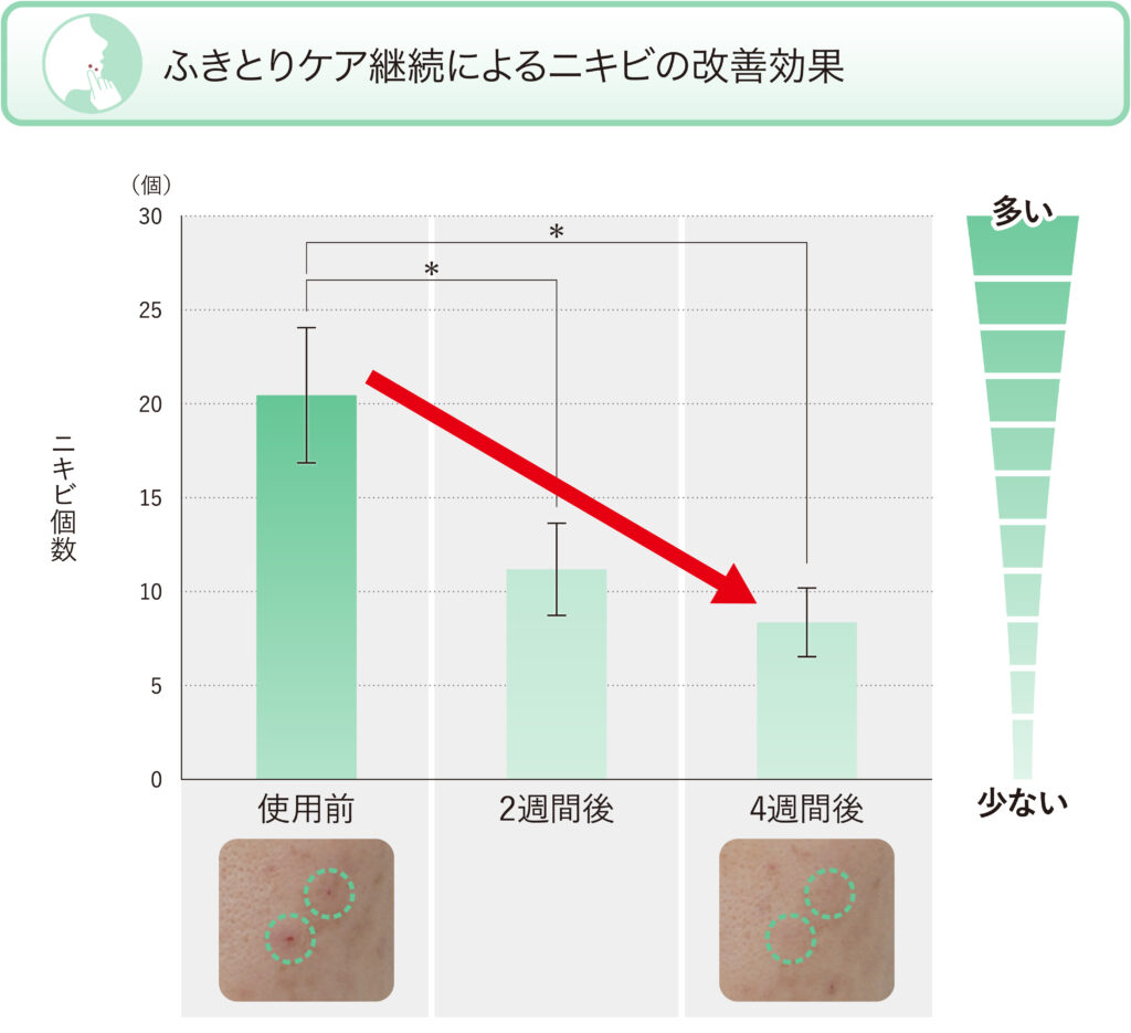 - 「ふきとりケア」を継続することで、ニキビ・肌あれの予防・改善ができることを確認しました。