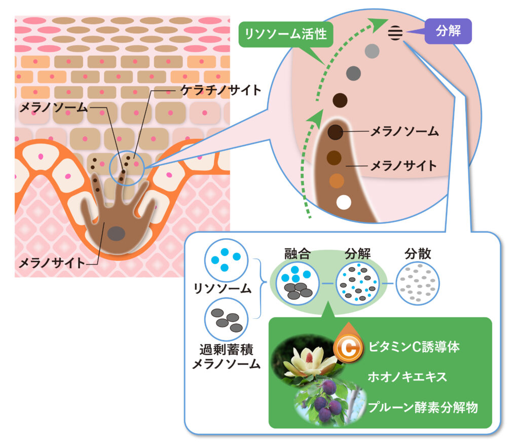 - ビタミンC誘導体(L-アスコルビン酸 2-グルコシド)、ホオノキ抽出液、プルーン酵素分解物の3成分を組み合わせることで、細胞内の消化力(リソソーム活性)を高め、シミの原因物質である過剰なメラノソームの分解を促して、シミのリスクを低減させる可能性を示しました。