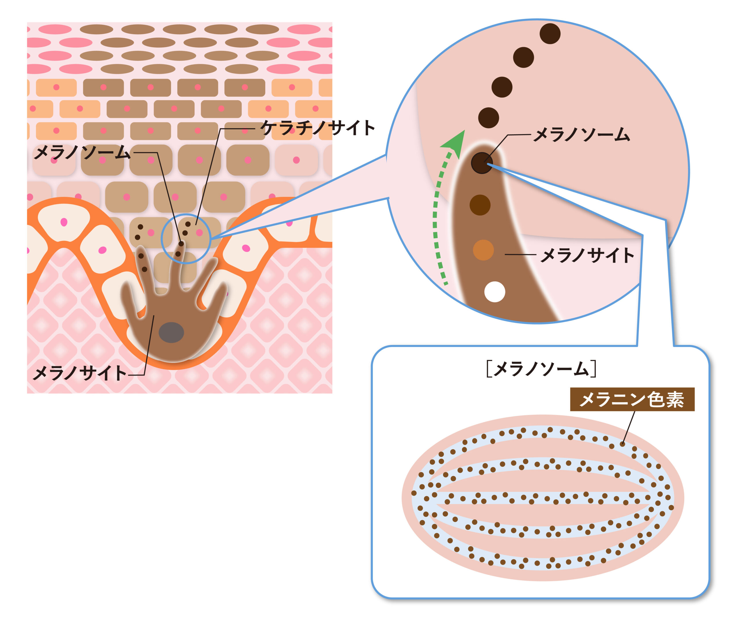 シミの原因物質である「メラノソーム」とは色素細胞(メラノサイト)で作られた黒色の物質「メラニン」が入った袋状の細胞小器官です(図3)。本来は紫外線から肌を守るために作られる物質で、通常はターンオーバーに伴い、垢となって排出されますが、紫外線ダメージが蓄積したり、歳を重ねたりすることで、過剰に作られるようになります。大きな塊となって肌に溜まることでシミになると考えられています。