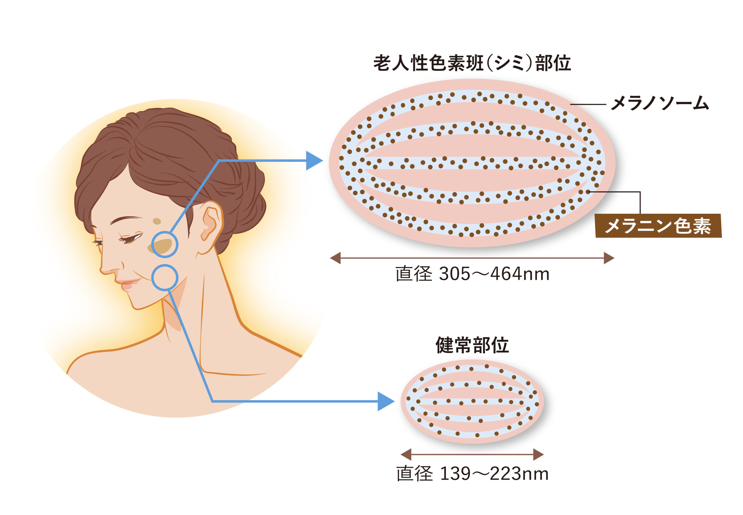 実際、加齢に伴って顕在化する老人性色素斑(シミ)の部位では、表皮細胞内に複数のメラノソームからなる塊が蓄積し、肌にとどまり続けることで濃く大きなシミが形成されるということが報告されています(引用文献1)。また、老人性色素斑部位では健常部位の倍以上の大きさのメラノソームが蓄積していることが知られています(図4、引用文献2)。大きなメラノソームの塊は目立つシミの一因だと考えられますので、メラノソームを適切な大きさに保つとともに、不要となったものを分解・排出させていくことがシミ予防において重要です。