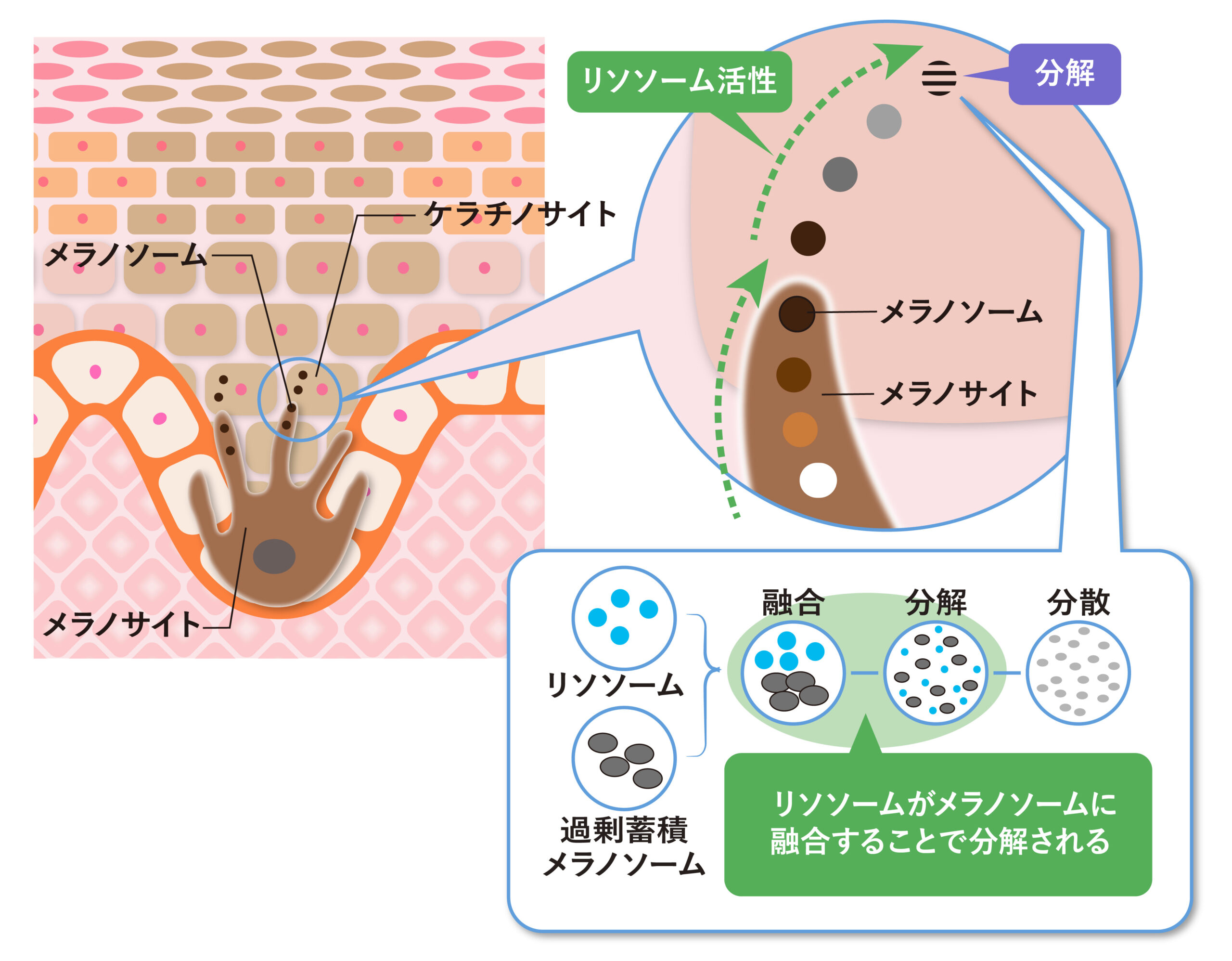 不要になったメラノソームの分解には、リソソーム(消化酵素がたくさん含まれている袋状の細胞小器官)が関与していると考えられています。近年の研究によると、皮膚色が明るい皮膚由来の表皮細胞の方が、暗い皮膚由来の細胞よりも消化酵素(リソソーム)の活性が高いことやメラノソームの消化が盛んに行われていることが明らかになっています(図5、引用文献3・4)。つまり、できてしまったシミでも、細胞内のリソソームの活性を高めることでメラノソームの分解を促し、徐々に薄くすることが可能であると考えられます。そこで、表皮細胞がもつリソソーム活性に着目し、その活性を高めるための研究と素材の開発を行いました。