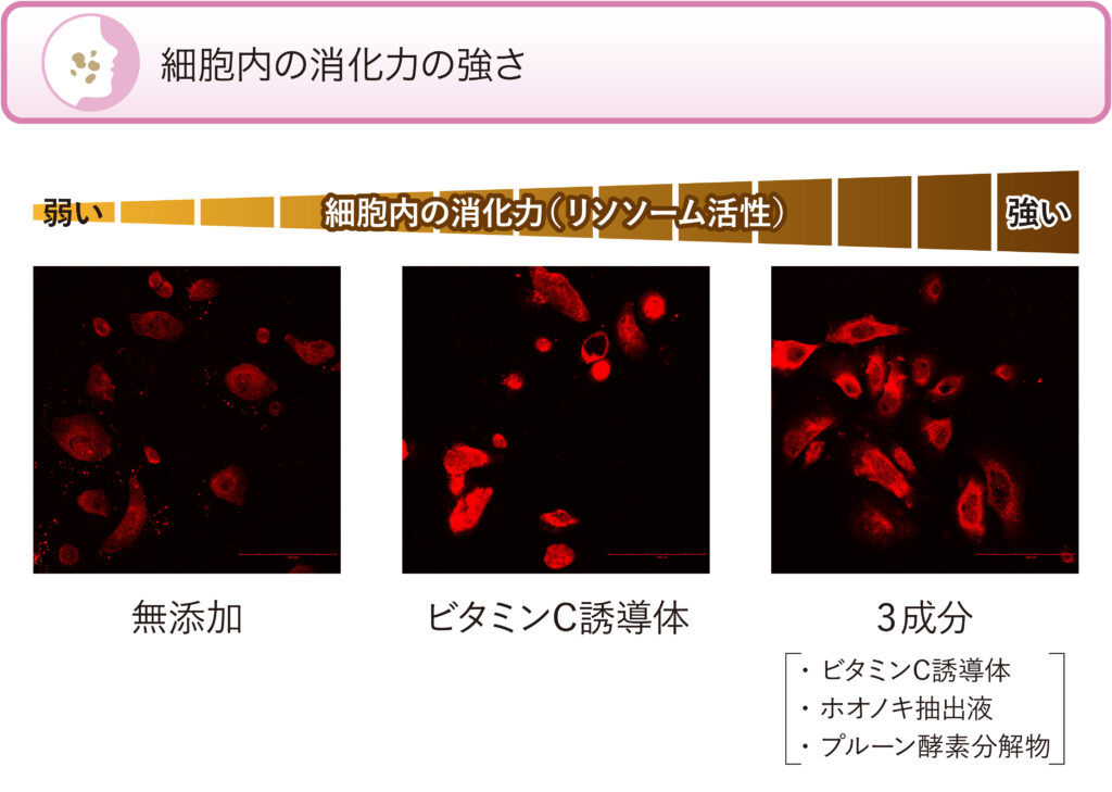 ビタミンC誘導体・ホオノキ抽出液・プルーン酵素分解物の3成分の組み合わせは細胞内の消化力(リソソーム活性)を高めることが確かめられました。リソソーム活性が高まることで、シミの原因物質であるメラノソームなどの不要となった物質の分解や排出を促している可能性が示唆されました。