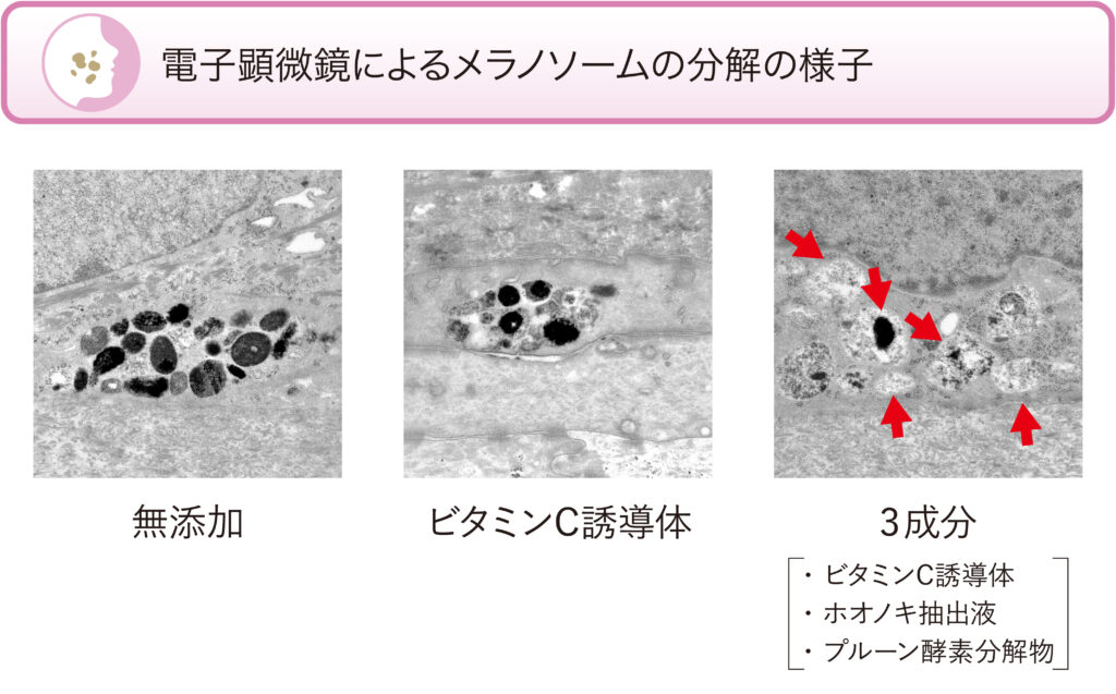 3次元表皮モデルに各成分を添加・培養した後、透過型電子顕微鏡にてメラノソームの様子を観察しました。その結果、ビタミンC誘導体・ホオノキ抽出液・プルーン酵素分解物の3成分を組み合わせることで、表皮細胞に含まれているメラノソームの分解が促される様子が可視化できました(図7)。
