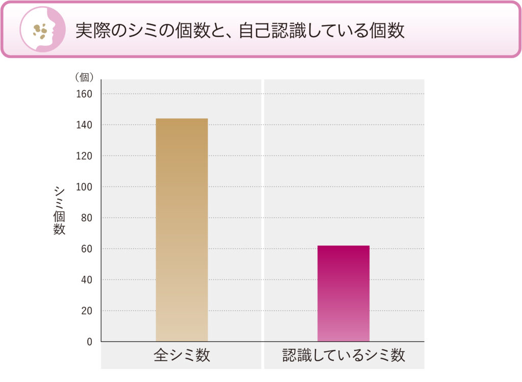 弊社が以前行った調査では、シミを気にしており、複数個あるにもかかわらず、実際に顔に存在しているシミの半分程度しか自己認識できていないという事実が判明しました(図2)。気づかず放置してしまった場合、シミの元となる大きなメラノソームがどんどん蓄積し、シミが大きく濃くなってしまいますし、スキンケア製品などで対処しても、効き目を感じにくくなってしまいます。