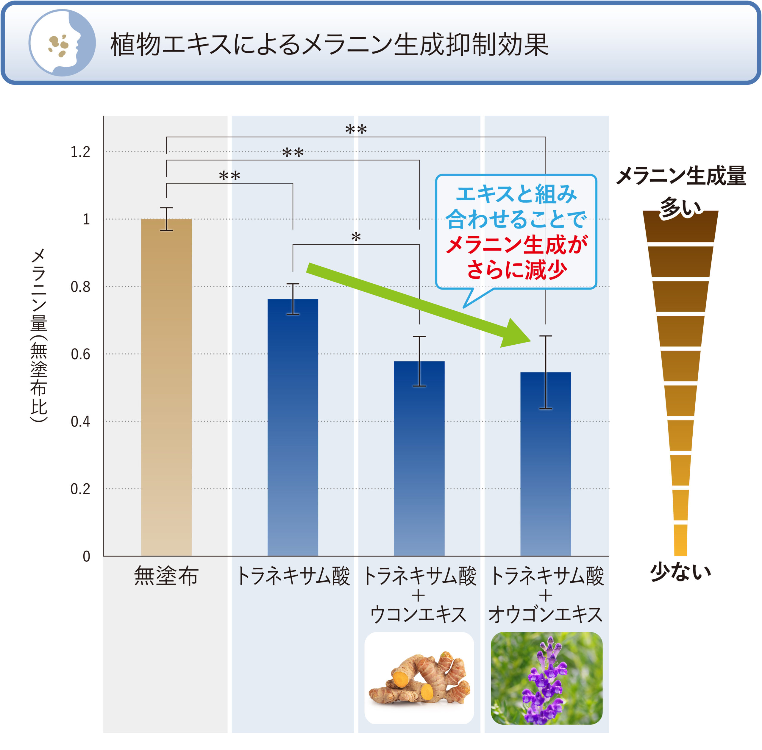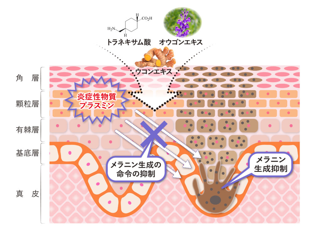 - オウゴンエキス·ウコンエキスは、トラネキサム酸のシミ抑制効果を高めました。