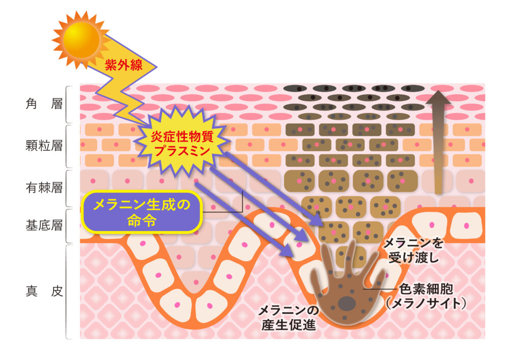 紫外線で活性が高まり、様々な因子を介してメラニン生成を促すことが知られている、炎症性物質の一種です(図2)。女性で多く見られる肝斑の原因の一つと考えられています。肝斑の内服薬・外用薬として汎用されているトラネキサム酸は、紫外線ダメージによるプラスミン活性を防ぐことで、肝斑などの色素斑に対する治療効果を発揮することが知られています。