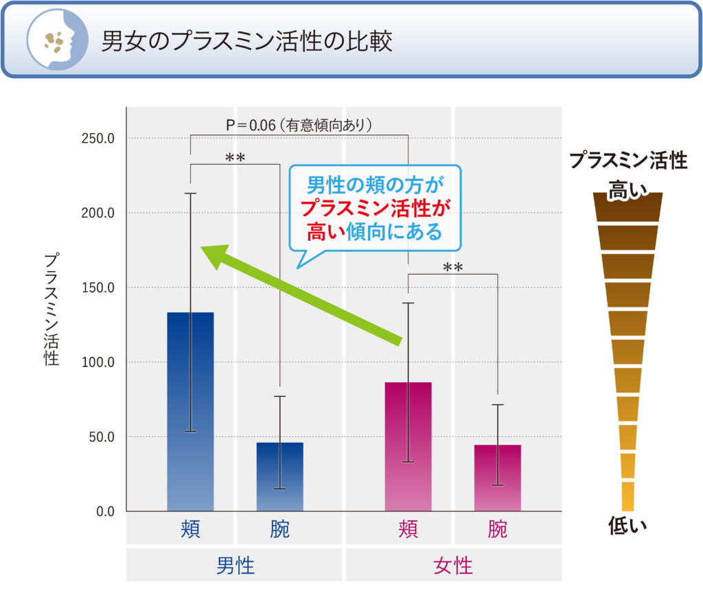 シミがある男性の頬および腕から角層を採取し、シミ部位の角層内に含まれている炎症性物質プラスミンの活性を測定しました。また、女性のシミ部のプラスミン活性と比較するとともに、シミの濃さとプラスミン活性に相関関係があるかどうかを確認しました。