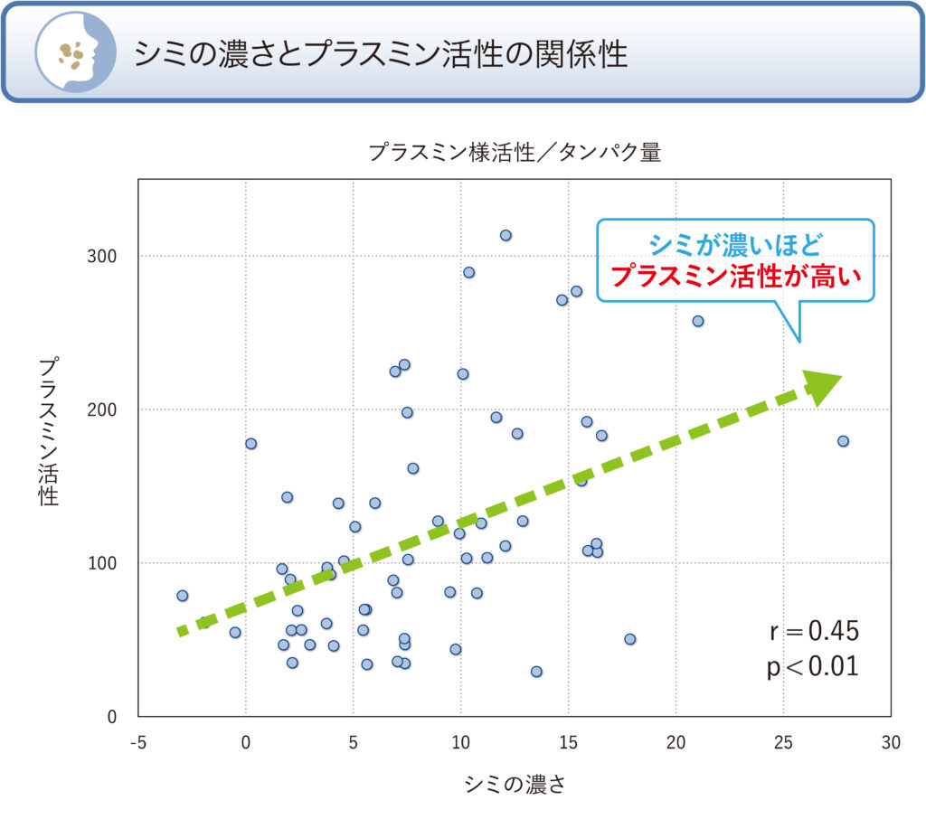 試験方法:皮膚色データを、CM 700d 分光測色計 (Konica Minolta, Japan)にて測定し、露光部である頬部の色調データから非露光部である上腕内側部の色調データを引いた値を⊿L値とした。シミ部および非シミ部より採取した角層のプラスミン活性(単位:fmol/min/µg)と⊿L(シミの濃さ)の相関関係を算出した。