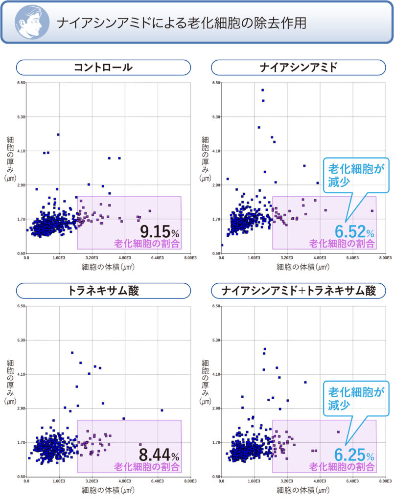 横軸を体積、縦軸を細胞の厚みとしてプロットした結果を図3に示します。その結果、ナイアシンアミド単体およびナイアシンアミドとトラネキサム酸を組み合わせて添加した細胞では、体積が大きく、平坦な細胞の割合がコントロールの細胞と比べて減少していました。つまり、老化した細胞を除去し、細胞の若返りを促している作用があると考えられます。