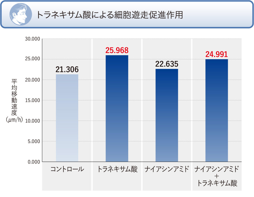 - シミ対策成分トラネキサム酸に、線維芽細胞の遊走速度(動く速さ)を高める効果があることを発見しました。(図1)