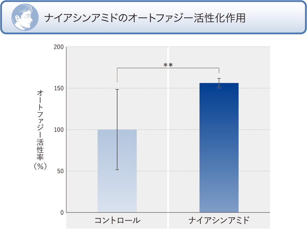 試験方法:RFP(赤色蛍光色素),GFP(緑色蛍光色素)および LC3(オ ートファジーマーカー)を融合させ細胞内で安定的に発現させたのち、 ナイアシンアミドを添加し 24 時間培養した。培養後、RFP および GFP の蛍光強度比を指標にオートファジー活性を算出した。 **P<0.01(t-test)
