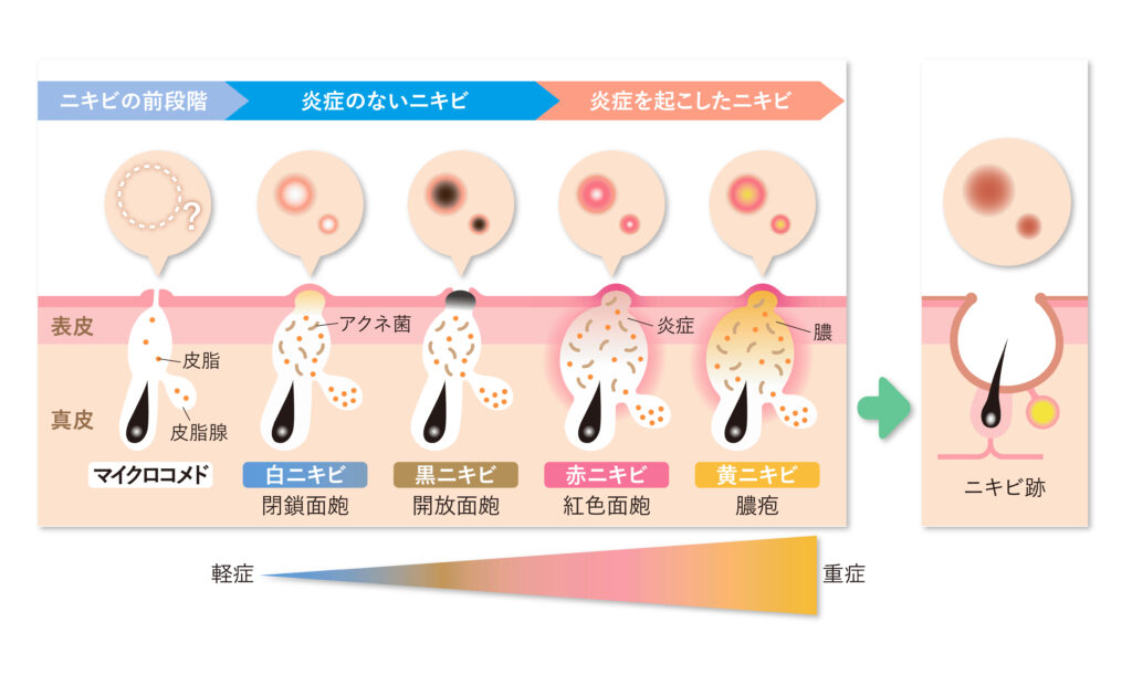 - 白ニキビ(閉鎖面皰): コメドのできはじめで、角栓が毛穴の内部にあり、皮膚がふくらんだ状態です。